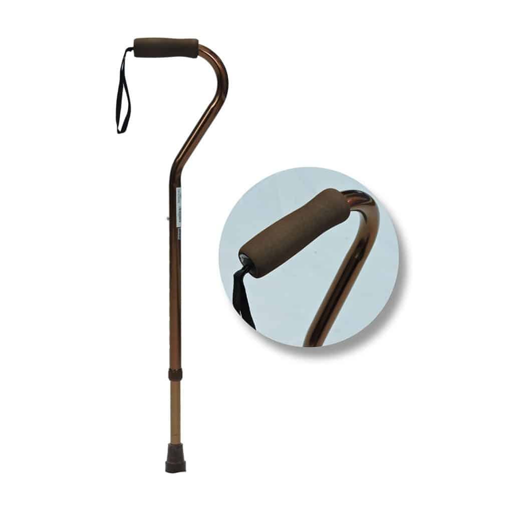 Bastón mango curvo en aluminio, color bronce, altura graduable. Cordón de sujeción para muñeca.