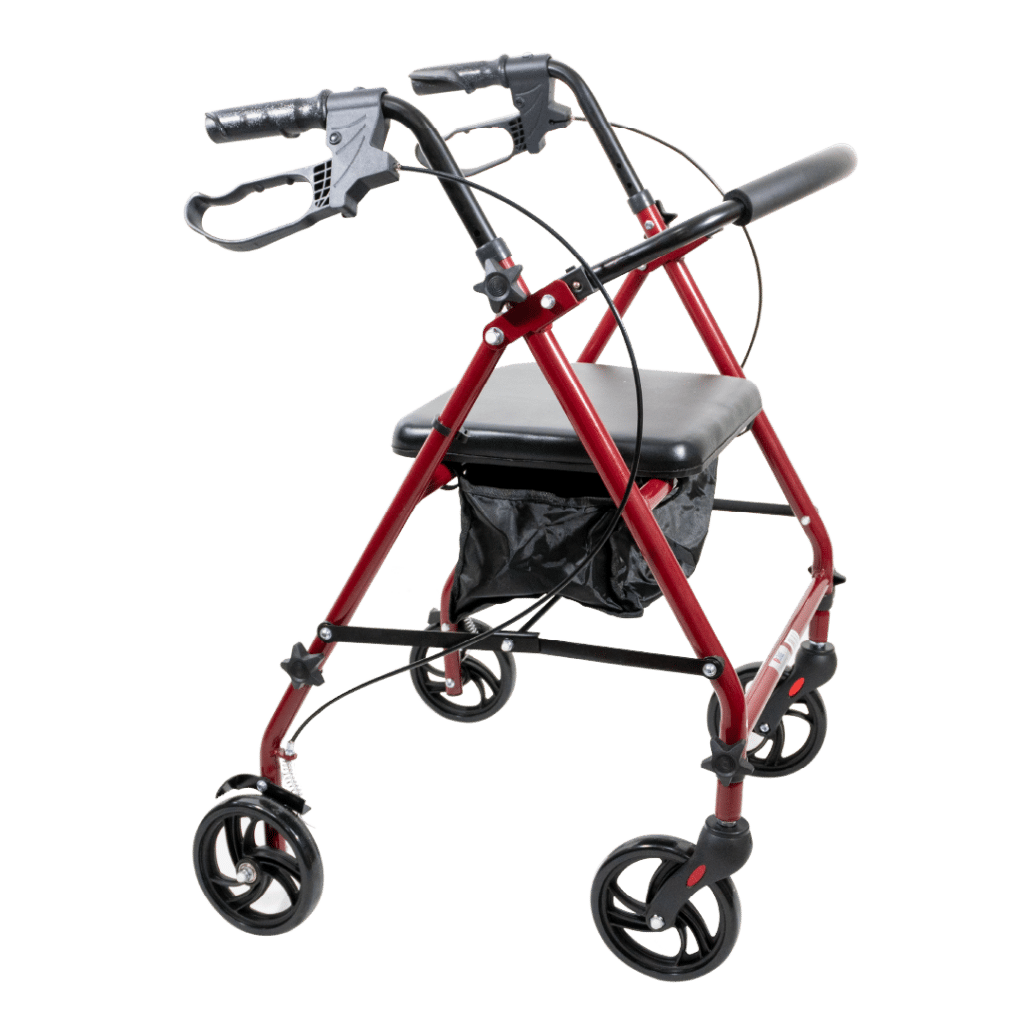 Caminador rollator rojo, estuctura en aluminio, 4 ruedas de 6”, altura graduable en manubrios, frenos de mano, asiento rígido acolchado,