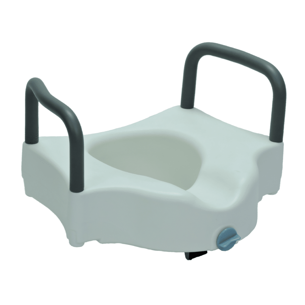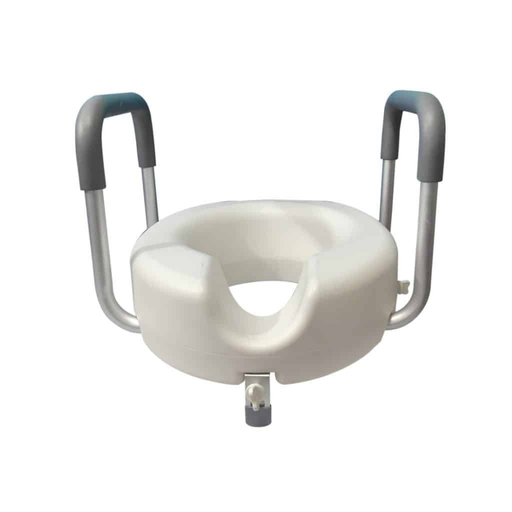 Apoya brazos fijos acojinados de hule espuma, abertura frontal, con 3 seguros para ajustar al inodoro.