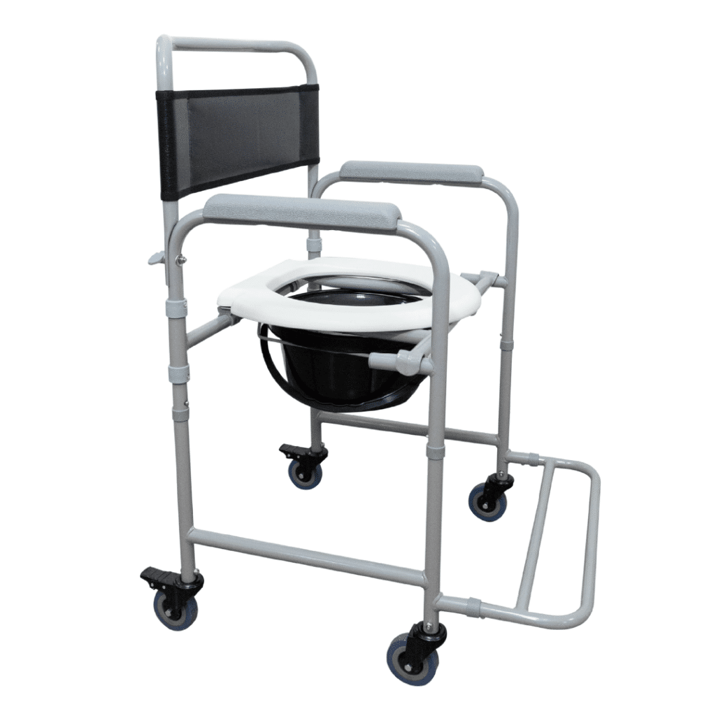 Diseñada para personas con movilidad reducida, esta silla cuenta con estructura en aluminio, ruedas con bloqueo y recipiente sanitario con