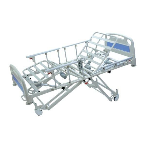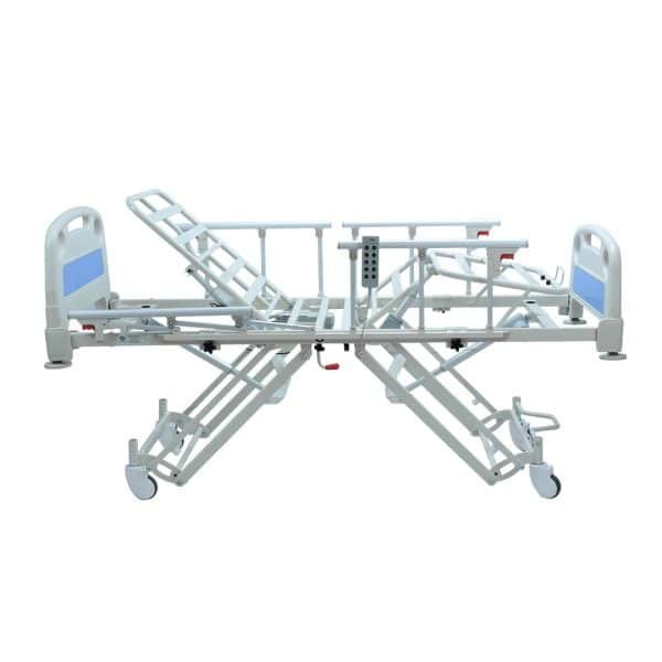 Cama hospitalaria ELECTRICA de cinco funciones (elevación de espaldar, elevación de rodilla, y altura del suelo, trendelenburg y trendelenburg revertido) barandas en aluminio plegables, 4 ruedas, dos de ellas con bloqueo, plataforma de colchón 4 sesiones, tablero desmontable de la cabeza/pie, elaborados en material ABS. Función CPR manual (solo del espaldar). Estructura en acero acabado en pintura electrostática blanca