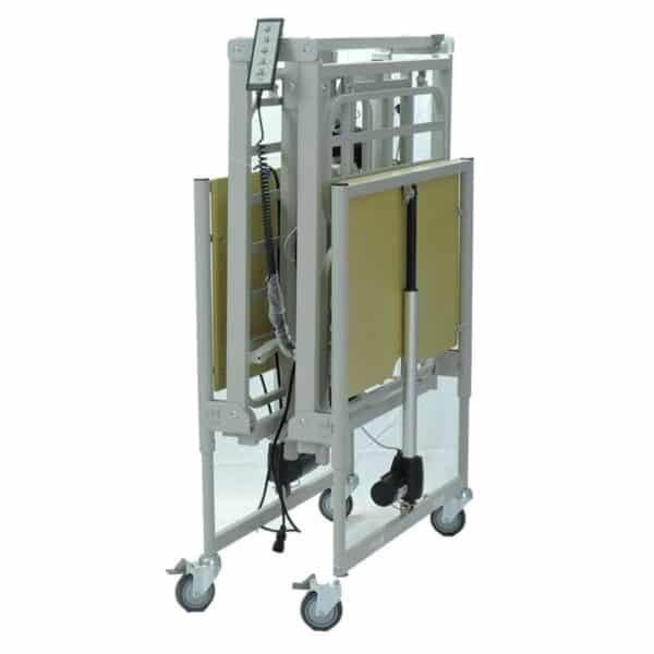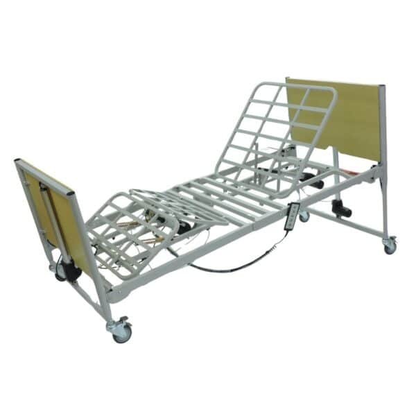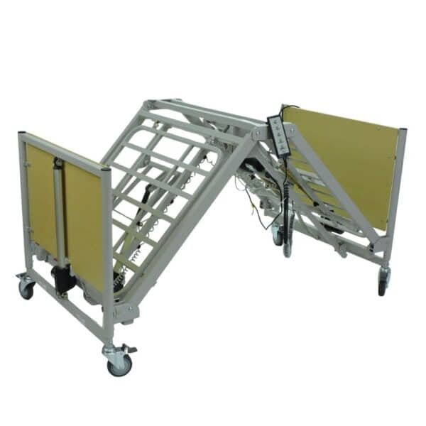 Cama Domiciliaria eléctrica de 5 funciones (Elevación de espaldar, elevación de rodillas, elevación altura, Trendelemburg y trendelemburg inverso), 4 ruedas con bloqueo, plataforma de colchón 4 secciones, tablero estructura en acero con panel de madera, estructura en acero color gris electrostática y plegado eléctrico. Cuenta además con Llave de Bloqueo para el Control Remoto