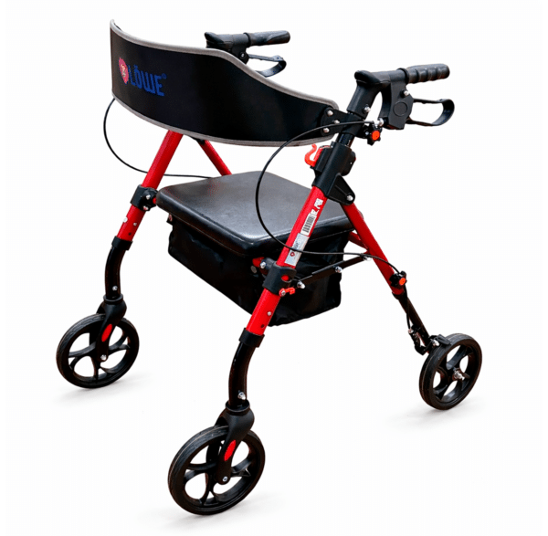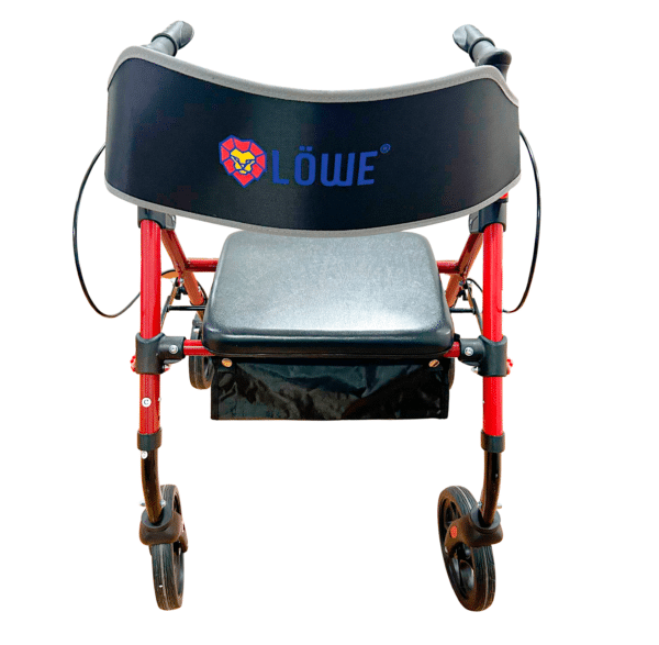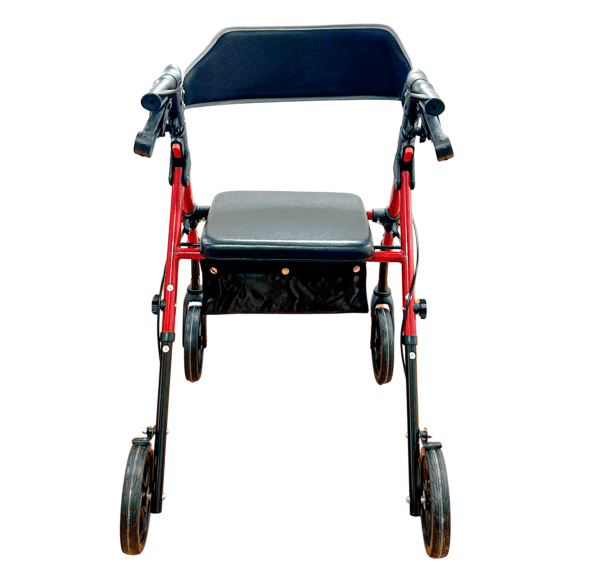 Caminador Rollator marco en aluminio y respaldo en acero, color rojo, altura graduable en los manubrios, plegable, 4 ruedas de 8”, manubrios con frenos, asiento rígido acolchado, y compartimiento tipo tula.