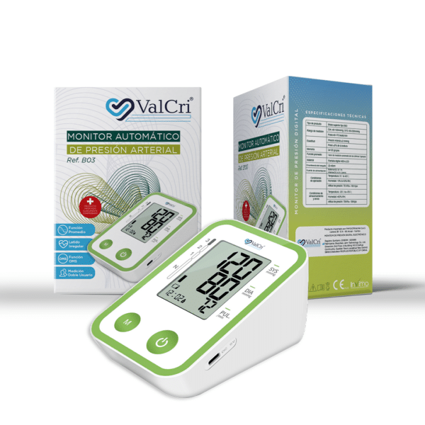 Monitor de presión arterial usado en el hogar. Dos usuarios, indicador de niveles de presión según la OMS, detector de latidos irregulares, símbolo error de movimiento. Funciona con: