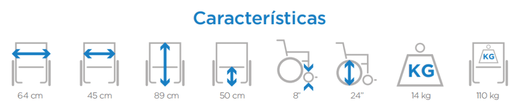 Cuenta con reposabrazos abatibles y reposapiés desmontables, facilitando la transferencia del usuario desde la cama o cualquier otro asiento. Además, su sistema de desmonte rápido permite un ensamblaje y desarmado ágil. Sus llantas de poliuretano y rines en estrella brindan estabilidad, seguridad y un desplazamiento suave en distintas superficies.
