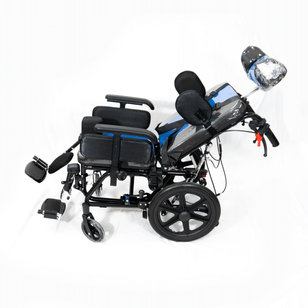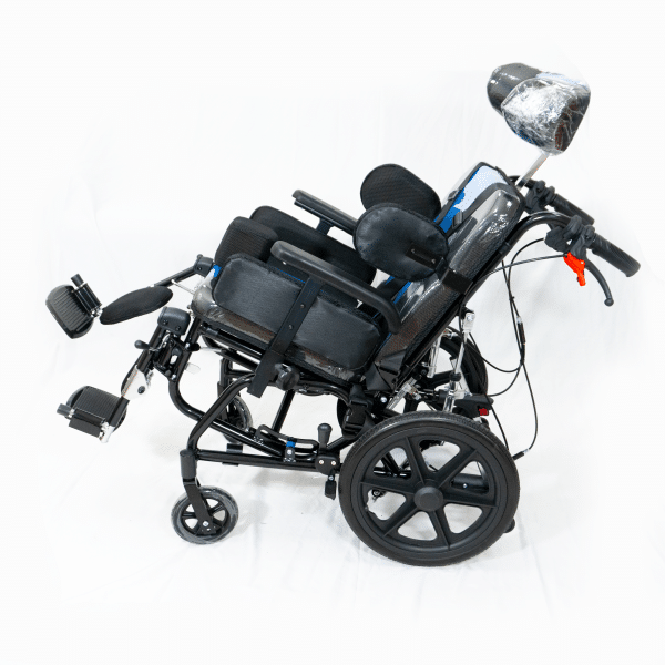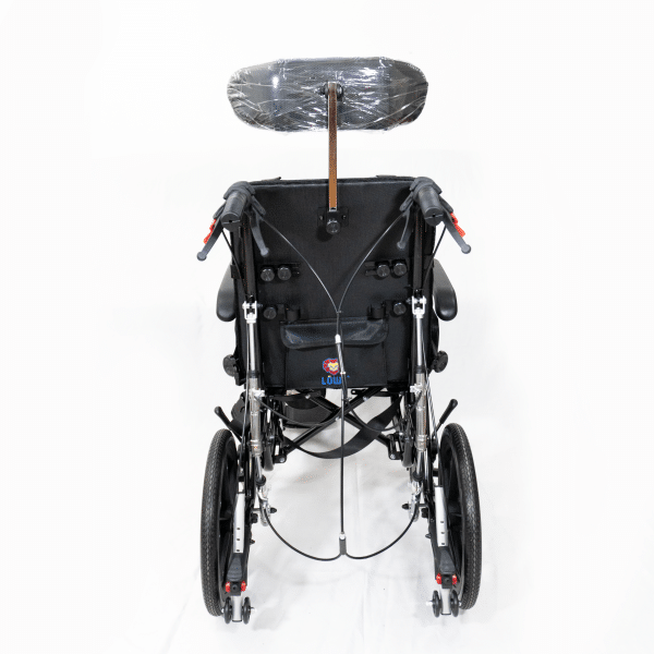 Sistema de reclinación y basculación del respaldo que facilita la ingesta de alimentos, favorece la postura prolongada en sedente y tolerancia de la misma. Tiene aditamentos acolchados para soporte de tronco y cabeza que proporcionan seguridad y mejora la postura del usuario.
