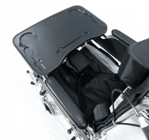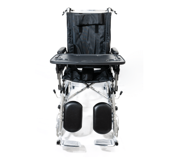 Silla de Ruedas Neurológica Semiescritorio con espaldar reclinable hasta 160°, fabricada en acero cromado y con tapicería en nylon. Diseñada para mayor comodidad y soporte, cuenta con cojín cefálico, cojines laterales y cojín abductores. Incluye reposabrazos abatibles, reposapiés desmontables y elevables (30° a 90°), y extensión de pieceros de hasta 10 cm. Equipada con mesa auxiliar, frenos, ruedas antivuelco y llantas macizas para mayor seguridad.