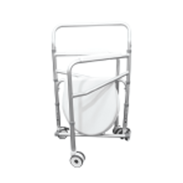 Silla Liviana, plegable y con altura ajustable. Ideal para personas con movilidad reducida; esta silla cuenta con estructura en acero cromado, facilita el uso del sanitario y el traslado seguro dentro del hogar. Cuenta con ruedas con bloquep en las traseras y recipiente sanitario con tapa.
