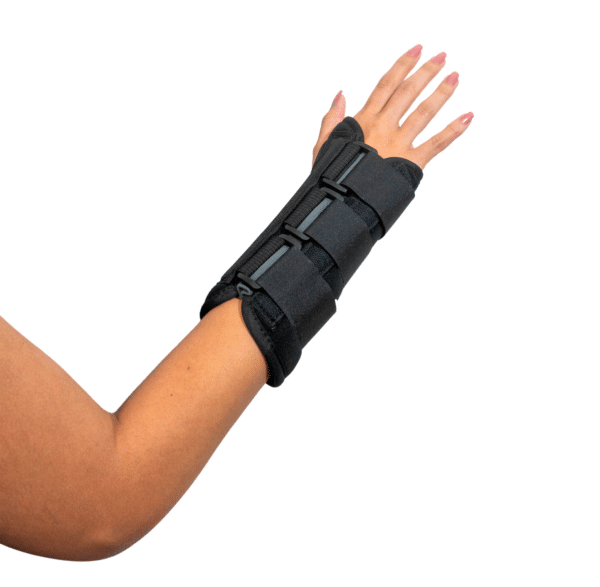 La muñequera está hecha de neopreno con tejido de nailon, férula de aluminio extraíble y cinta elástica con cierres de velcro.