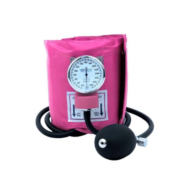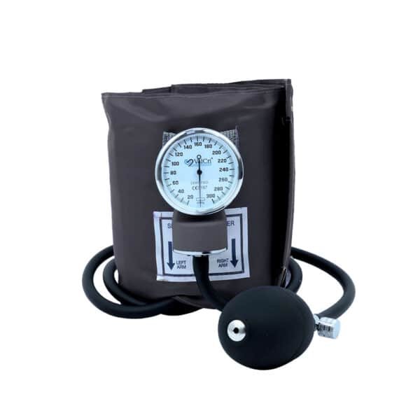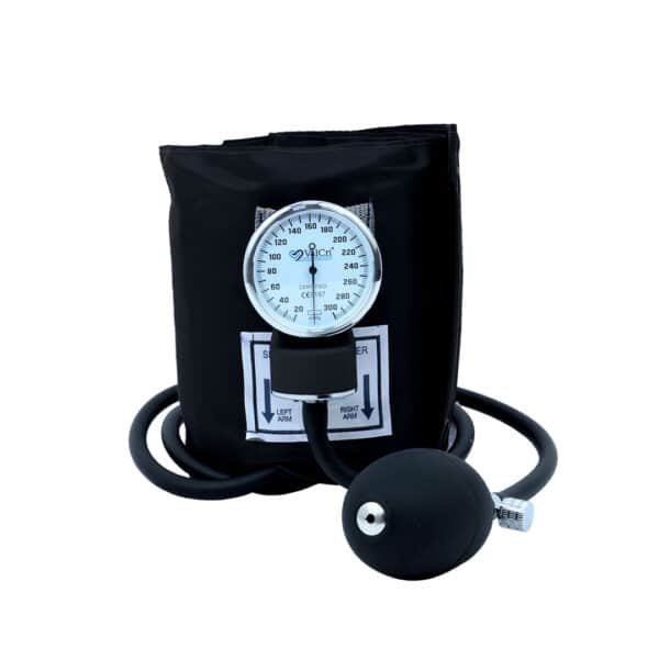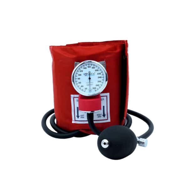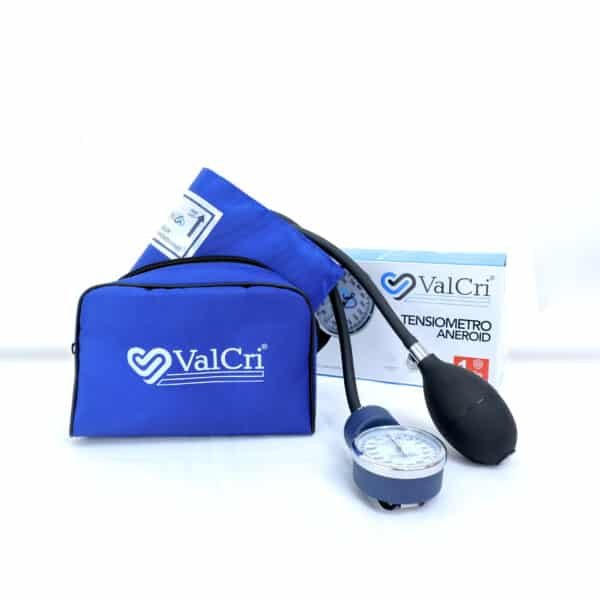 • Tensiómetro aneroide con brazalete en nylon y ajustable en velcro a la dimensión del brazo, cámara en TPU amigable con el medio ambiente y libre de látex.